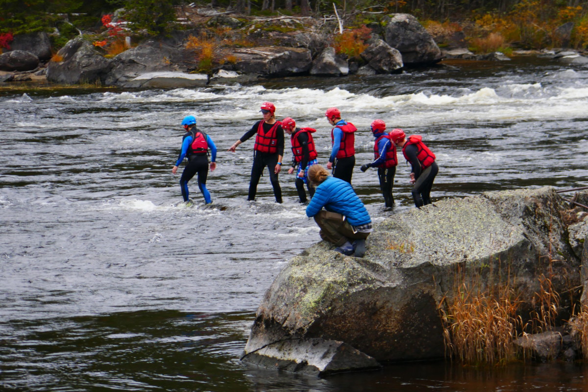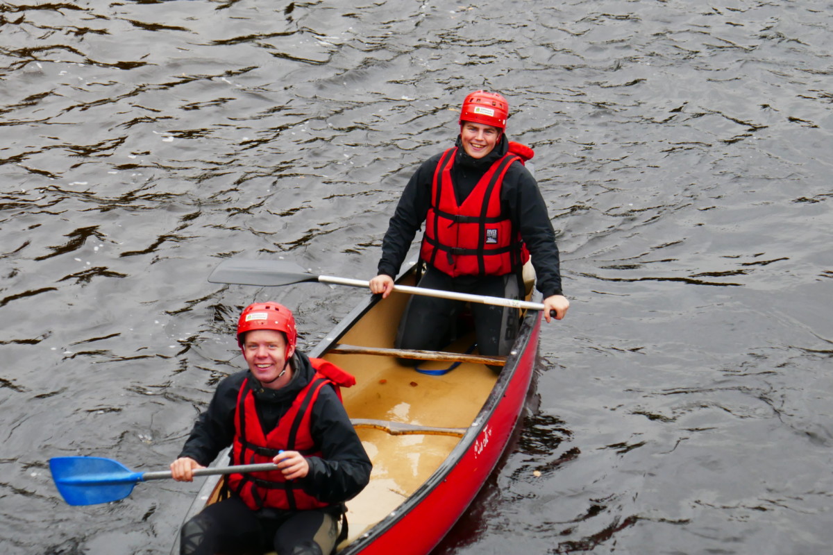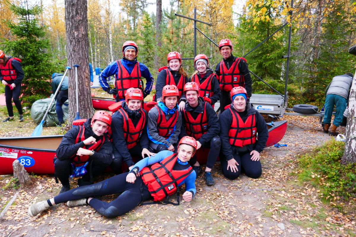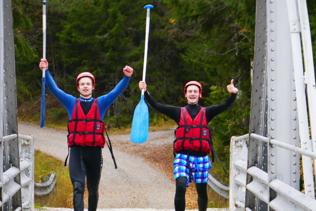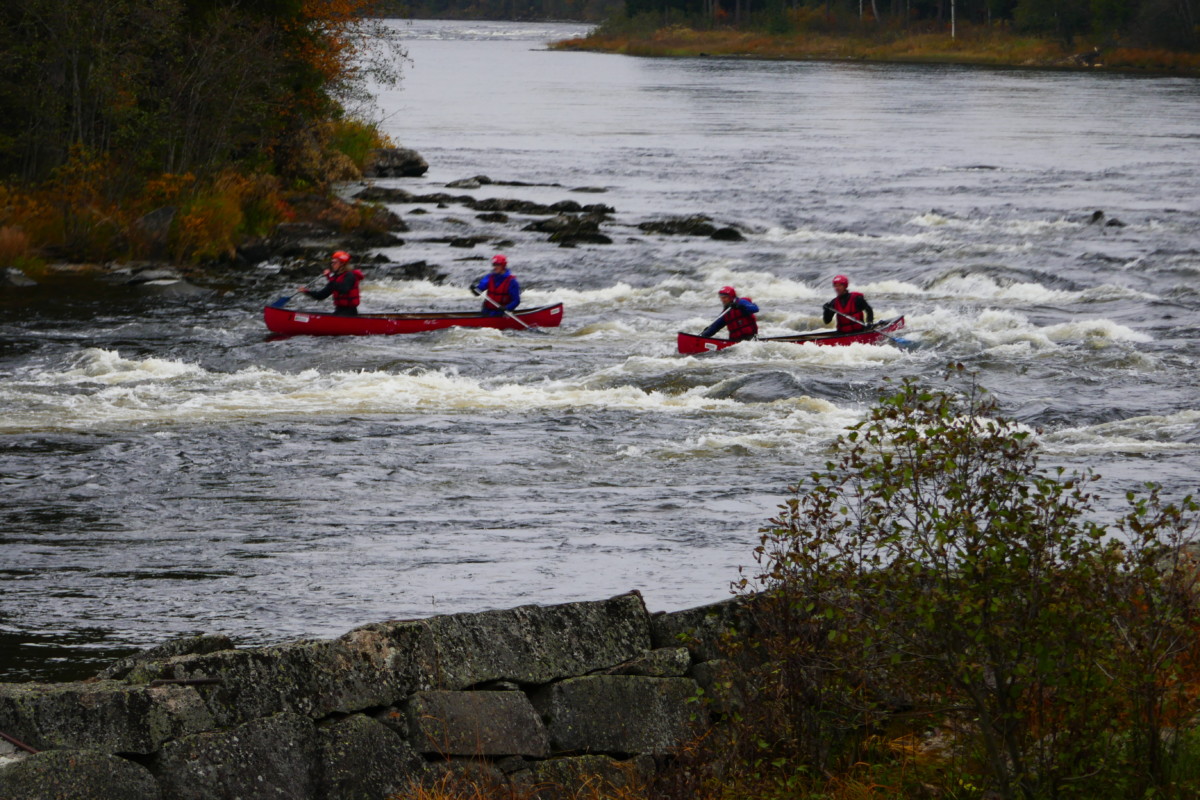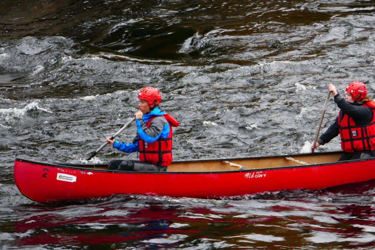 Våra instruktörer var elever från kursen Turism och Friluftsliv vid Klarälvdalens folkhögskola. Efter en noggrann säkerhetsgenomgång var det dags att pröva paddlarna i kanoter på vattnet. Nu gällde det att hålla huvudet kallt utan att blöta ner sig genom ofrivilliga bad. De skummande vågorna fick pulsen att rusa och det blev en dag av snabba beslut för att undvika stenar och sk ”valsar” där vattnet roterar som i en tvättmaskin.